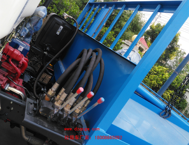 組成部分:國內知名品牌東風多利卡原裝底盤(全國聯保)、垃圾箱、取力器、多路換向閥、擺臂、液壓系統、操作系統等組成。(舉升油缸及鎖緊油缸系我廠自行研發生產的雙作用油缸。)